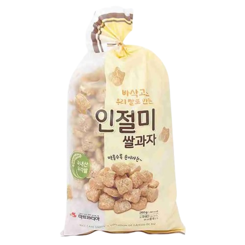 Injeolmi is rice cake made with sweet rice (glutinous rice). It’s one of the most popular and common Korean rice cakes. Mart Korea Injeolmi Rice Biscuit is made of rice and has injeolmi flavour. It is crunchy and savory.